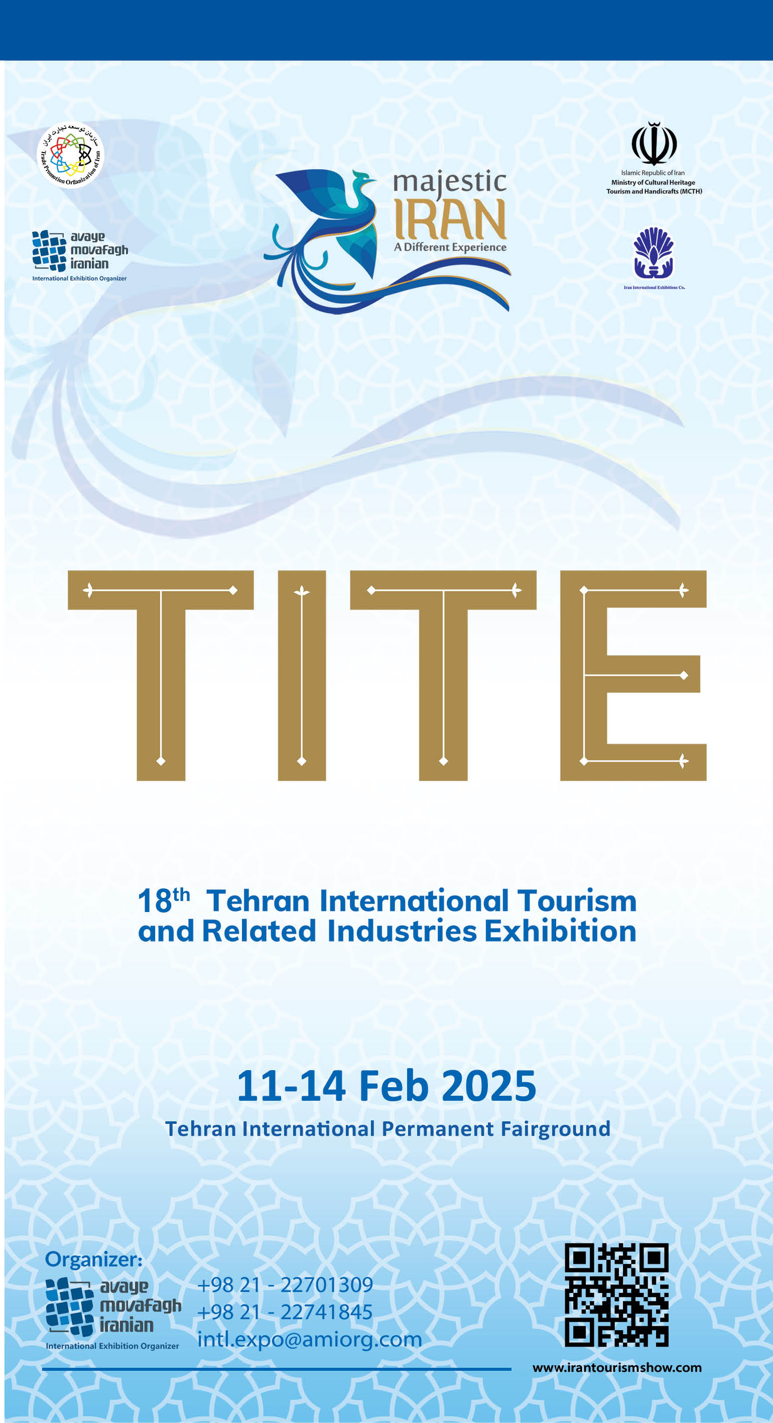 The 18th Tehran International Tourism & Related Industries Exhibition (TITE) will be held with permission of Trade Promotion Organization of lran and it is supported by the Ministry for Cultural Heritage, Tourism and Handicrafts of the Islamic Republic of Iran (MCTH).