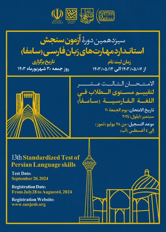 به اطلاع میرساند که سیزدهمین دوره آزمون سنجش استاندارد مهارت های زبان فارسی (سامفا)، روز جمعه 30 شهریورماه 1403برگزار خواهد شد.