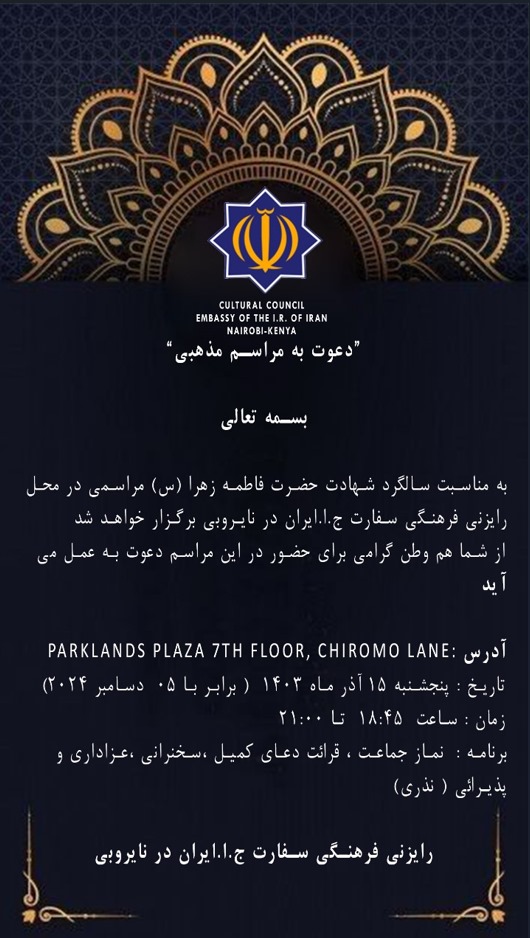 به مناسبت شهادت حضرت فاطمه زهرا (س) مراسمی روز پنجشنبه مورخ 15 آذرماه 1403 برابر با 5 دسامبر 2024 در محل رایزنی فرهنگی سفارت جمهوری اسلامی ایران در نایروبی برگزار میگردد. حضور تمام هموطنان گرامی در این مراسم موجب امتنان خواهد بود.
